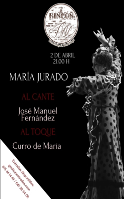 El 2 de abril en el "Rincón del Arte" contamos con el espectáculo flamenco de María Jurado, al baile, José Manuel Fernández, al cante, y Curro de María, al toque.