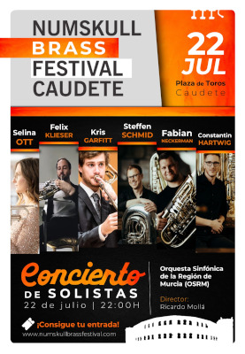 La octava edición de Numskull Brass Festival Caudete celebra la clausura de su Ciclo de Conciertos Nocturnos mediante el Concierto de Solistas, en el que la Orquesta Sinfónica de la Región de Murcia acompaña a seis solistas internacionales de gran prestigio internacional en la música de viento metal. El concierto se celebra al aire libre en el marco histórico de la plaza de toros «Las Arenas» de Caudete.